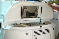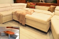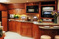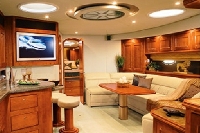 客厅 樱桃木造组合柜配以仿皮革包装制成的三面(U型)沙发,营造出一个优雅且富现代感的客厅区。 中央液压式操作的桌子,可应多样性空间应用需求而调升作一个实用的餐区,或降低兼收藏作一个既温馨又舒适的起居室。沙发备有电动装置可转换成一张大床。 此外,客厅具有一个"锁定"TracVision 功能的大平面屏幕电视与多个扬声器的音响系统;及220V 反向循环空调系统。