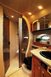 卫浴设备 主人及访客卧室皆具备"TankWatch"监控系统功能的真空冲洗厕所、大玻璃门的淋浴室连椅子组、 仿花岗岩的洗面槽和绣有贵客名字的毛巾。 |