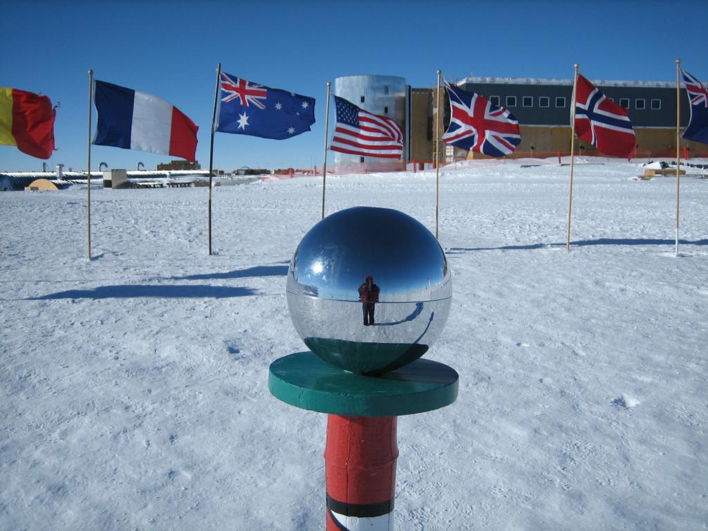 Sign at the (ever moving) actual geographical South Pole (a few feet away from the Ceremonial Pole)