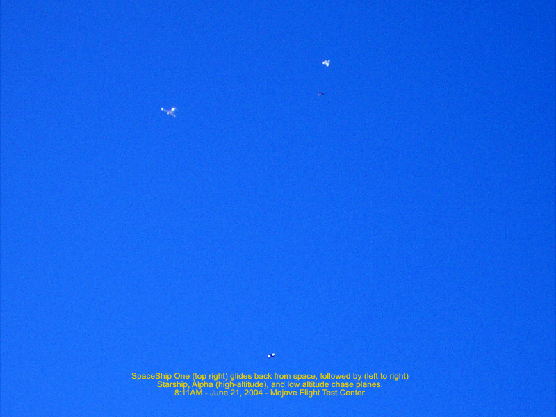 Spaceship One (top right) glides back from space followed by chase planes - 8:11AM 100.75 Kb